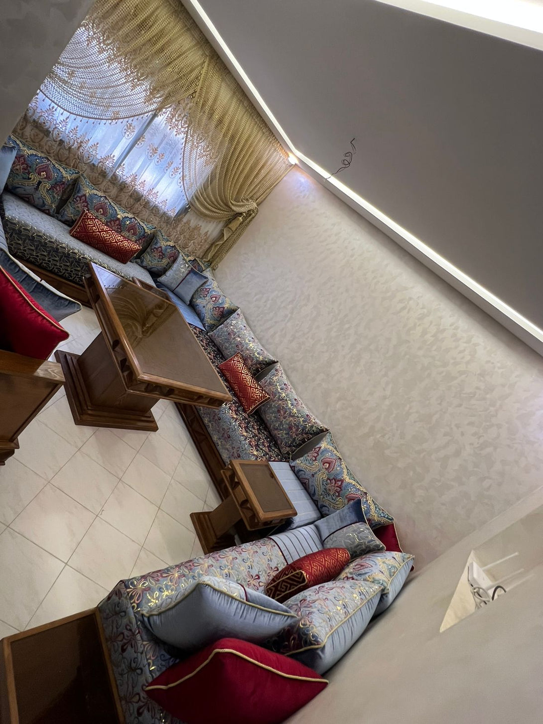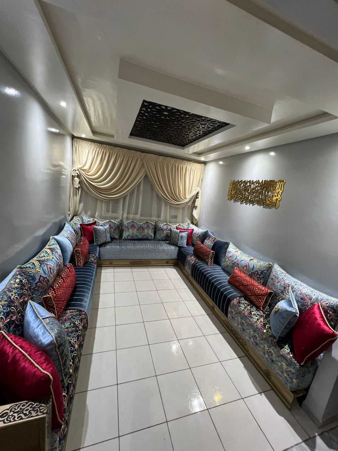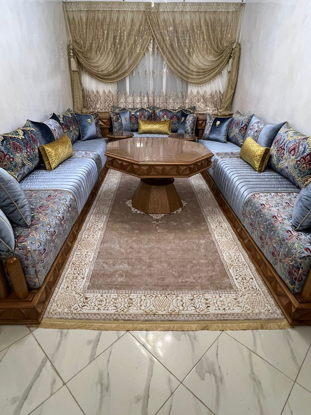 Bringen Sie zeitlose Eleganz und authentischen marokkanischen Charme in Ihren Wohnraum mit diesem handgefertigten luxuriösen marokkanischen Majlis-Sofa-Set . Mit exquisiter Stickerei, kunstvoll geschnitzten Holzsockeln, weicher Polsterung und atemberaubenden Stoffkombinationen eignet sich dieser U-förmige Salon perfekt, um eine warme und einladende Atmosphäre für Familienfeiern oder besondere Anlässe zu schaffen.