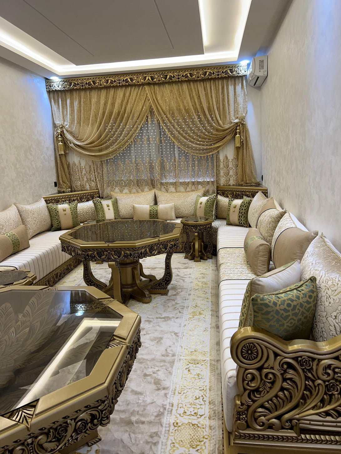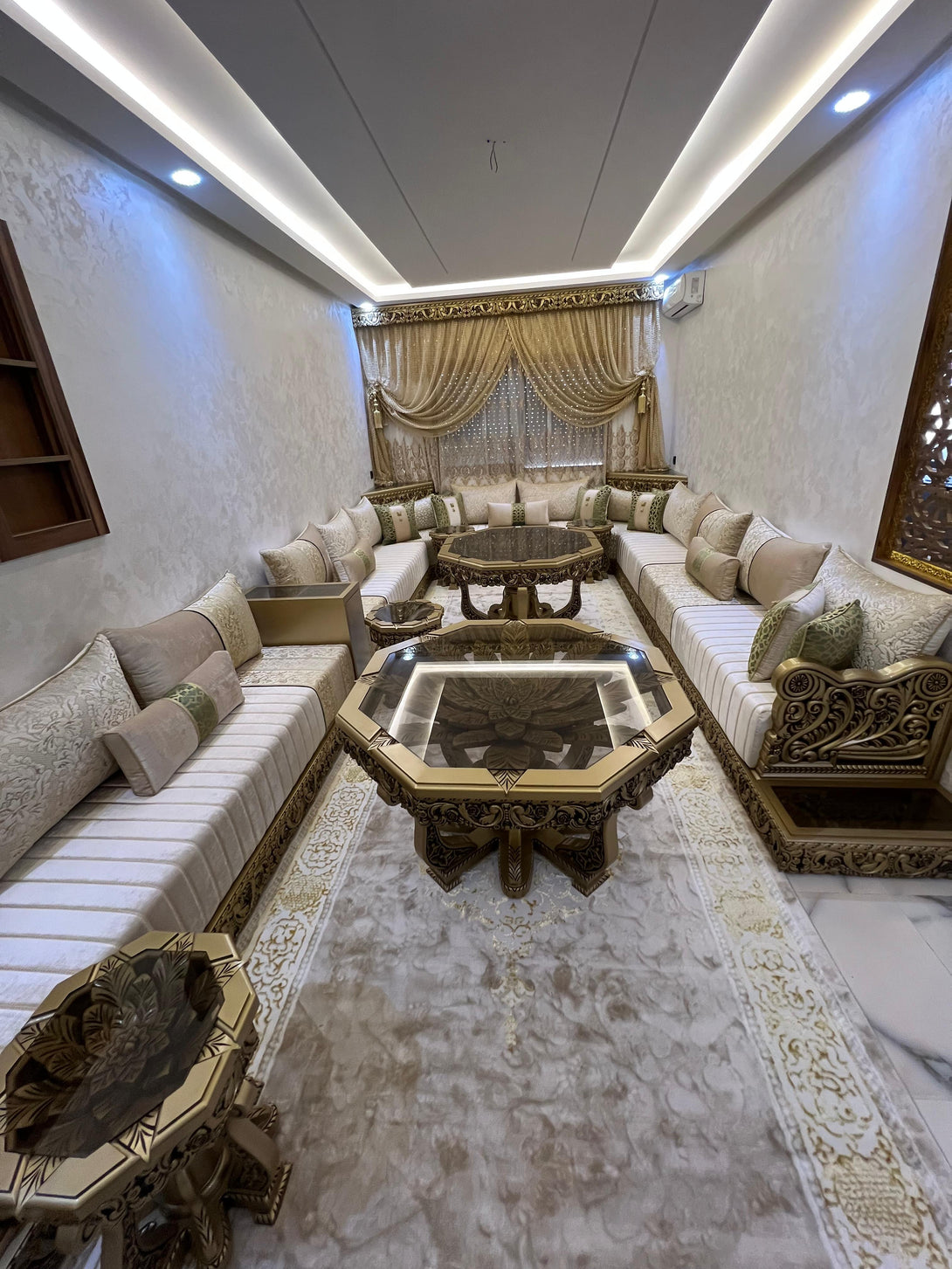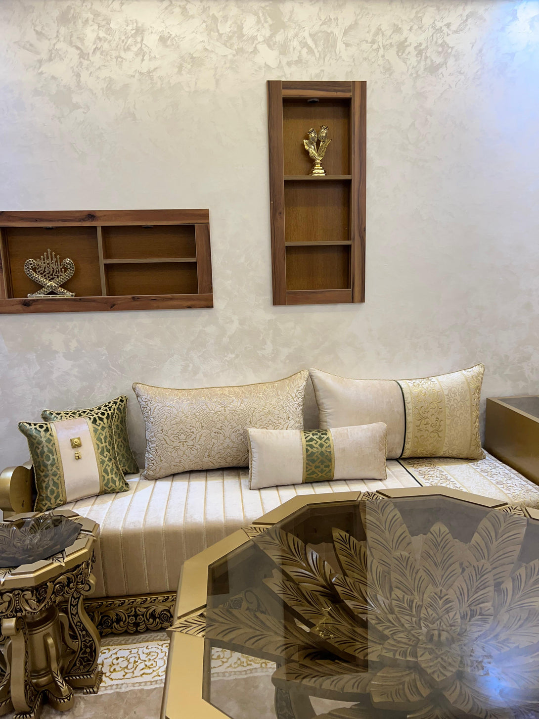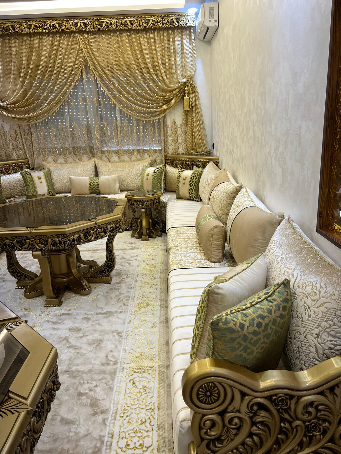 Bringen Sie zeitlose Eleganz und authentischen marokkanischen Charme in Ihren Wohnraum mit diesem handgefertigten luxuriösen marokkanischen Majlis-Sofa-Set . Mit exquisiter Stickerei, kunstvoll geschnitzten Holzsockeln, weicher Polsterung und atemberaubenden Stoffkombinationen eignet sich dieser U-förmige Salon perfekt, um eine warme und einladende Atmosphäre für Familienfeiern oder besondere Anlässe zu schaffen.