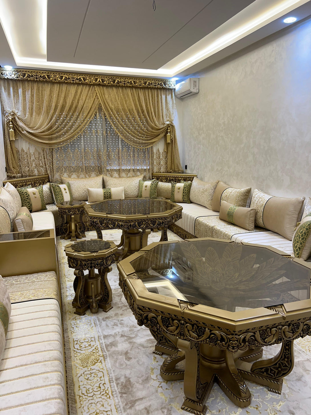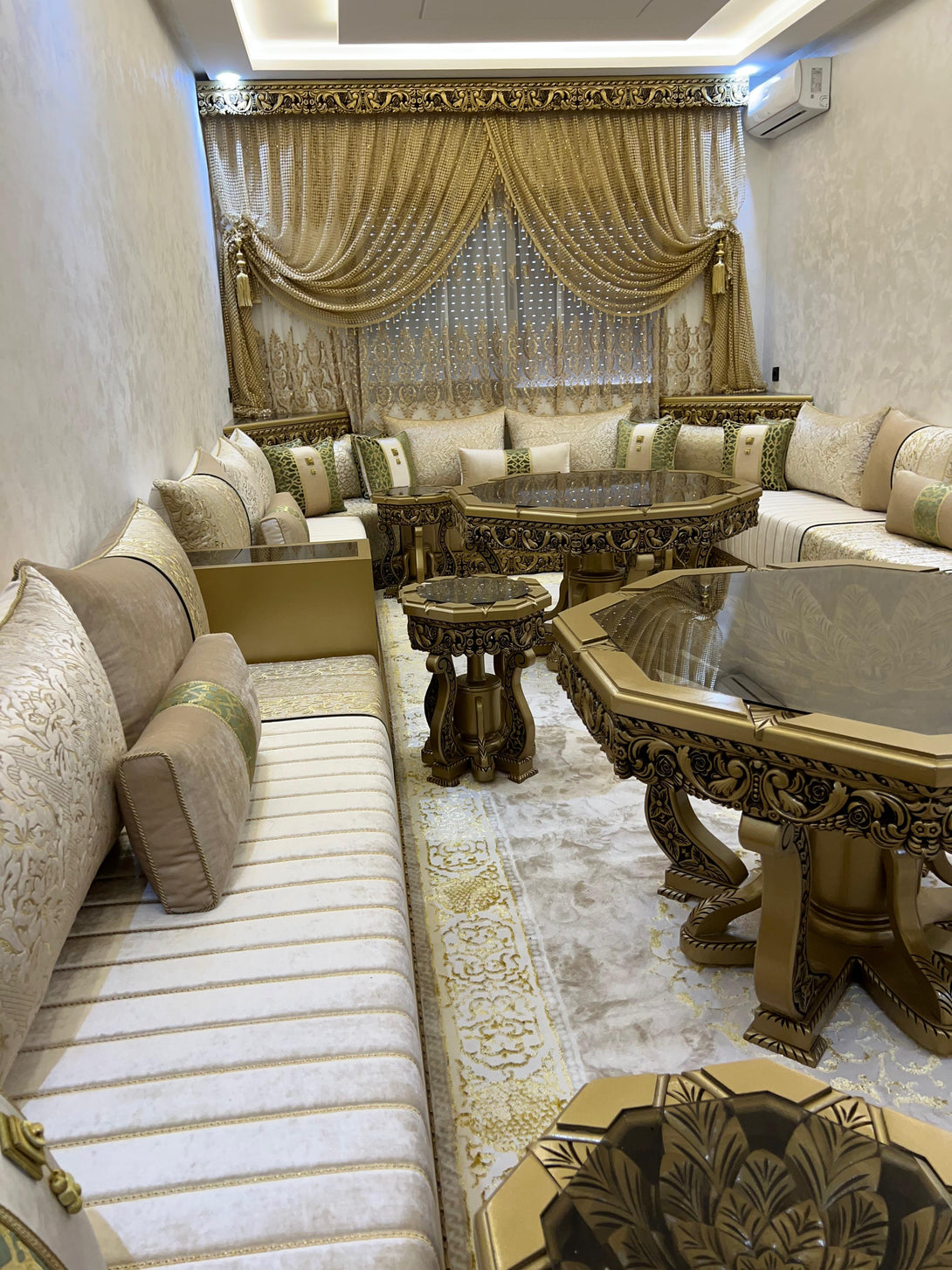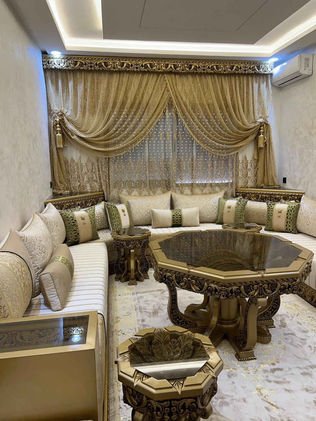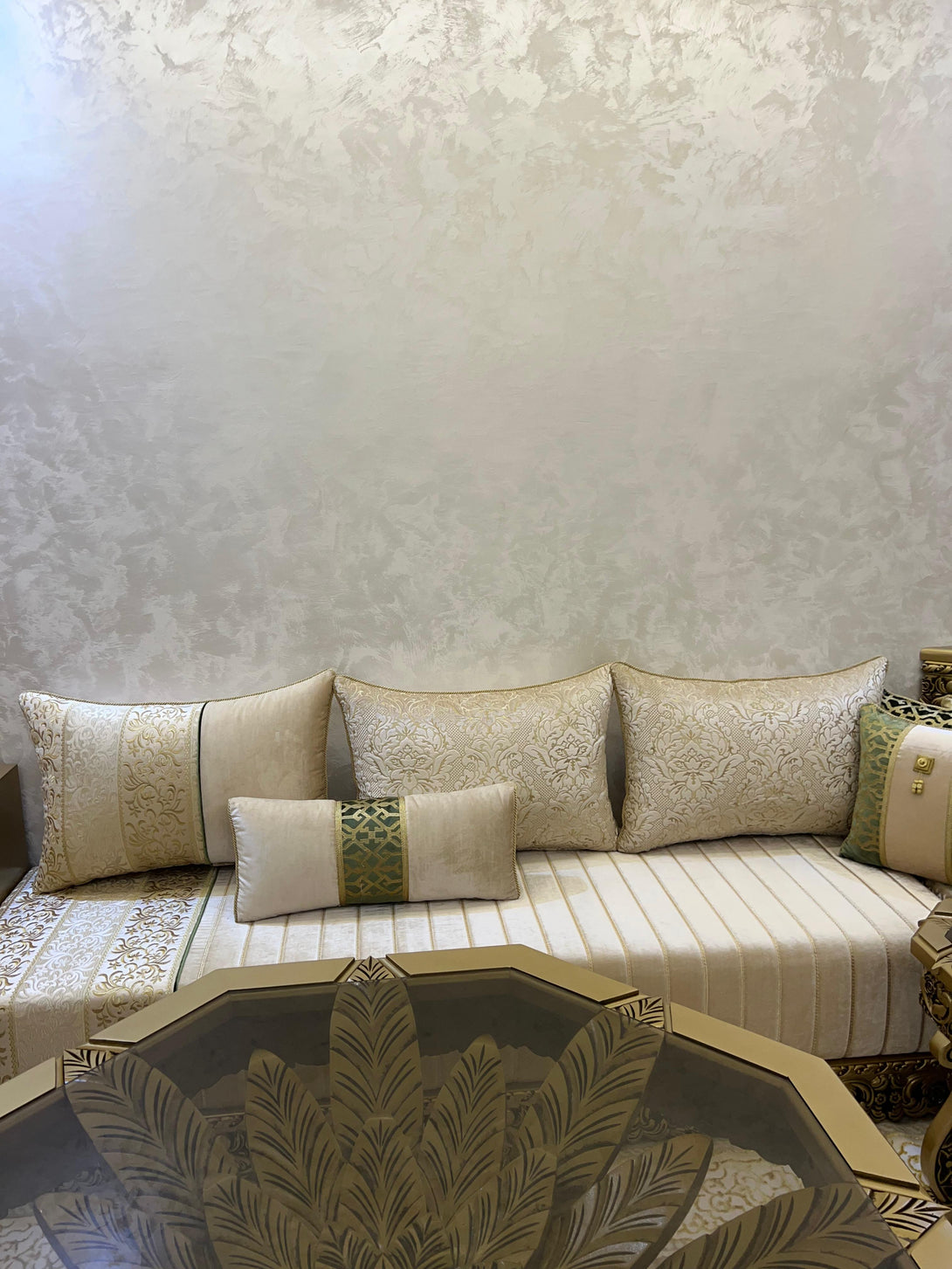 Bringen Sie zeitlose Eleganz und authentischen marokkanischen Charme in Ihren Wohnraum mit diesem handgefertigten luxuriösen marokkanischen Majlis-Sofa-Set . Mit exquisiter Stickerei, kunstvoll geschnitzten Holzsockeln, weicher Polsterung und atemberaubenden Stoffkombinationen eignet sich dieser U-förmige Salon perfekt, um eine warme und einladende Atmosphäre für Familienfeiern oder besondere Anlässe zu schaffen.